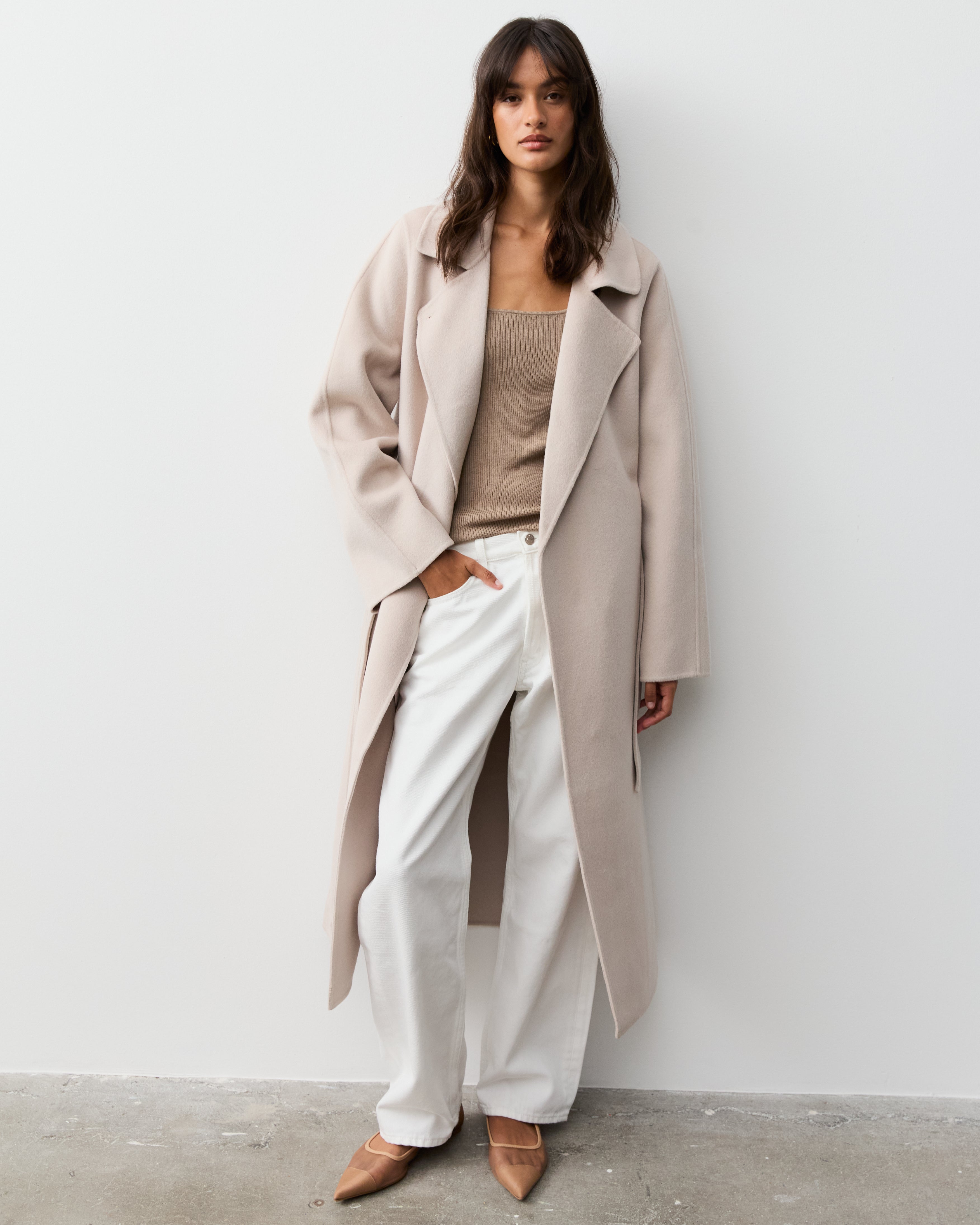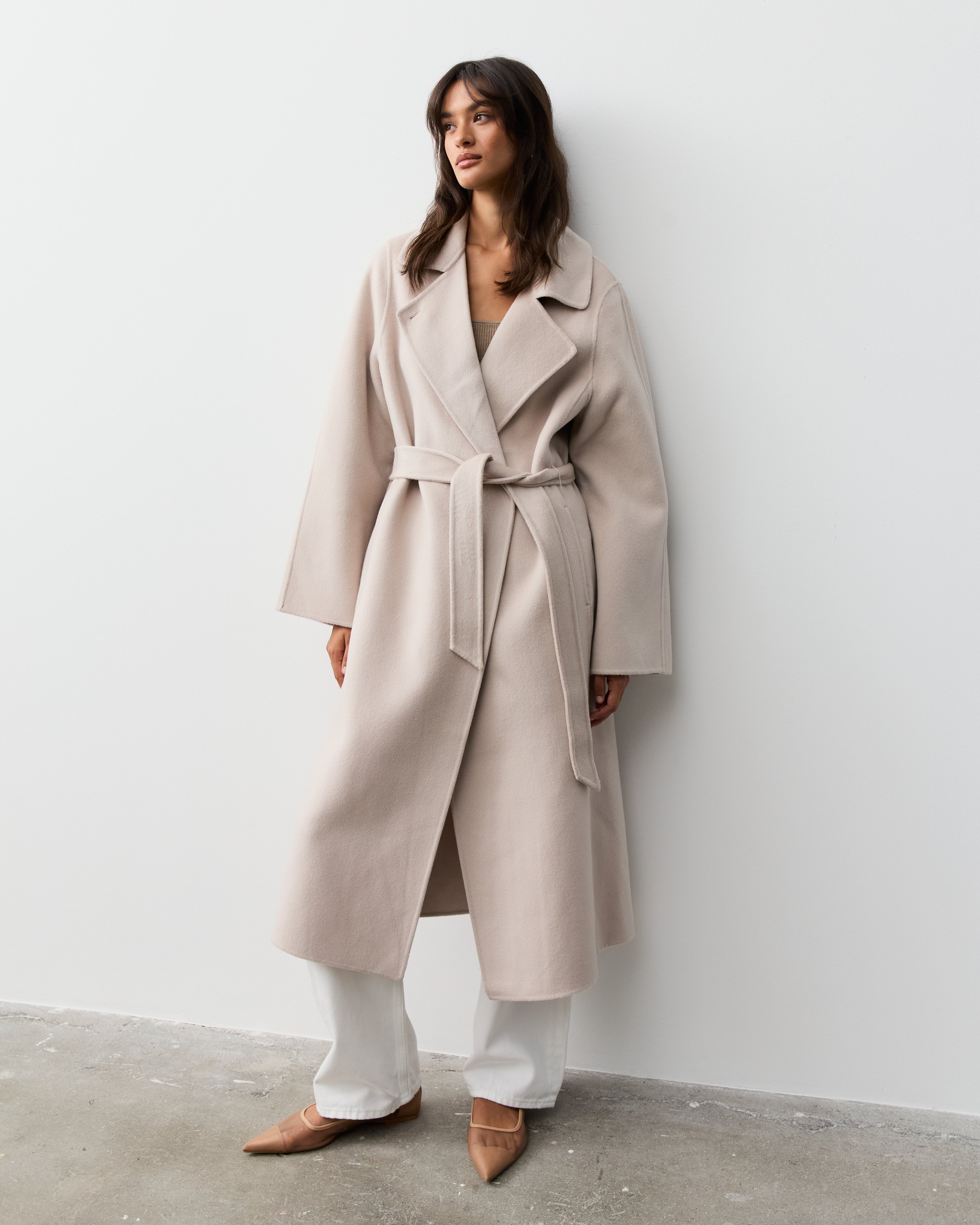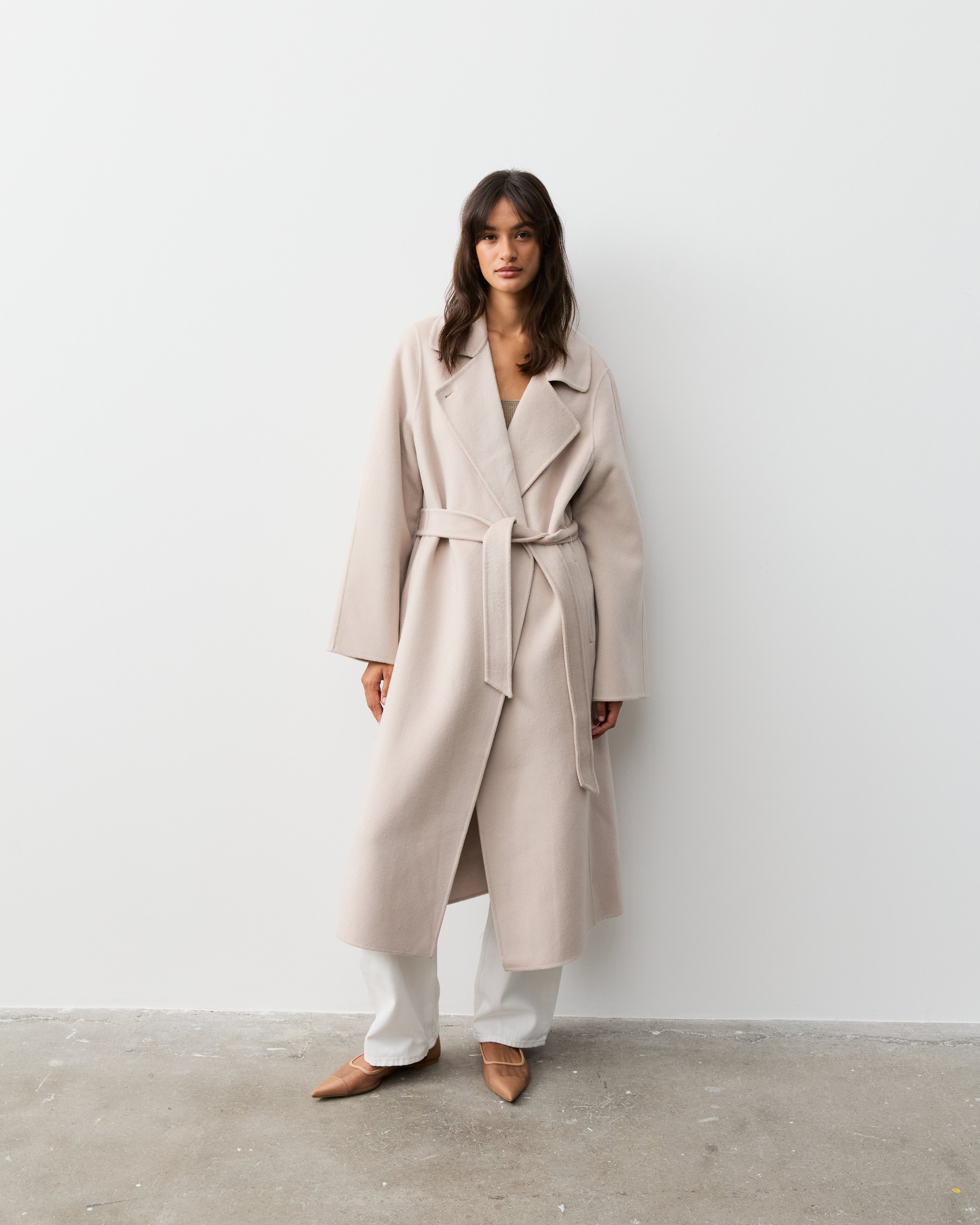Our double faced coats are created with our signature blends of cashmere and superfine merino wool, sourced from Inner Mongolia. This cashmere is celebrated for its softness, warmth, and lightweight properties, making it an ideal choice for luxurious outerwear. Complementing the cashmere, our fine merino wool is known for its incredible softness and excellent thermal regulation, adding durability and resilience to the fabric, ensuring our coats maintain their shape and beauty over time.
