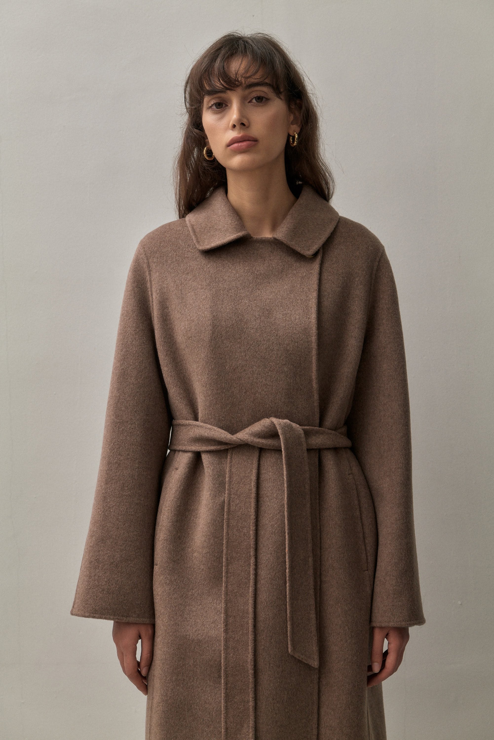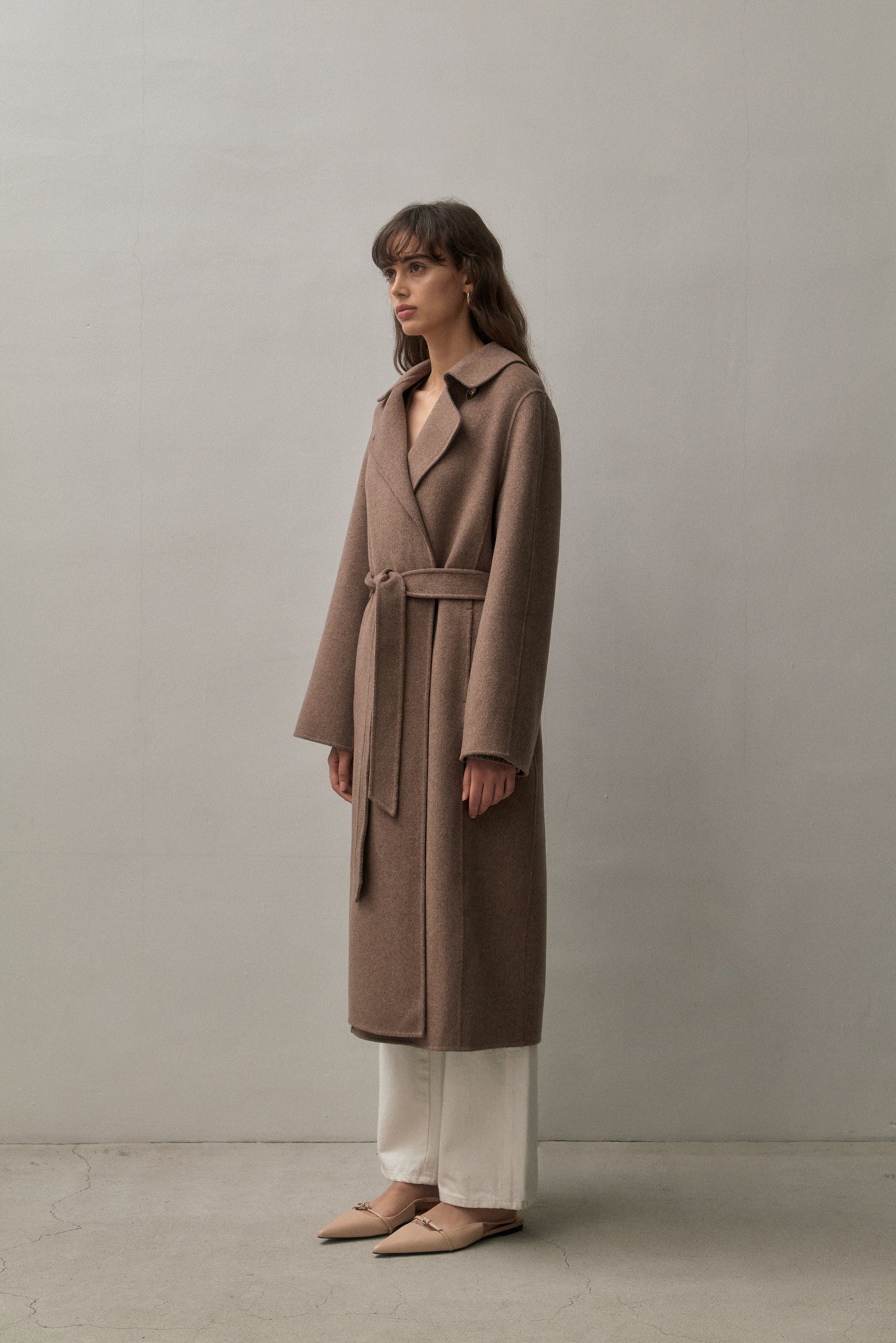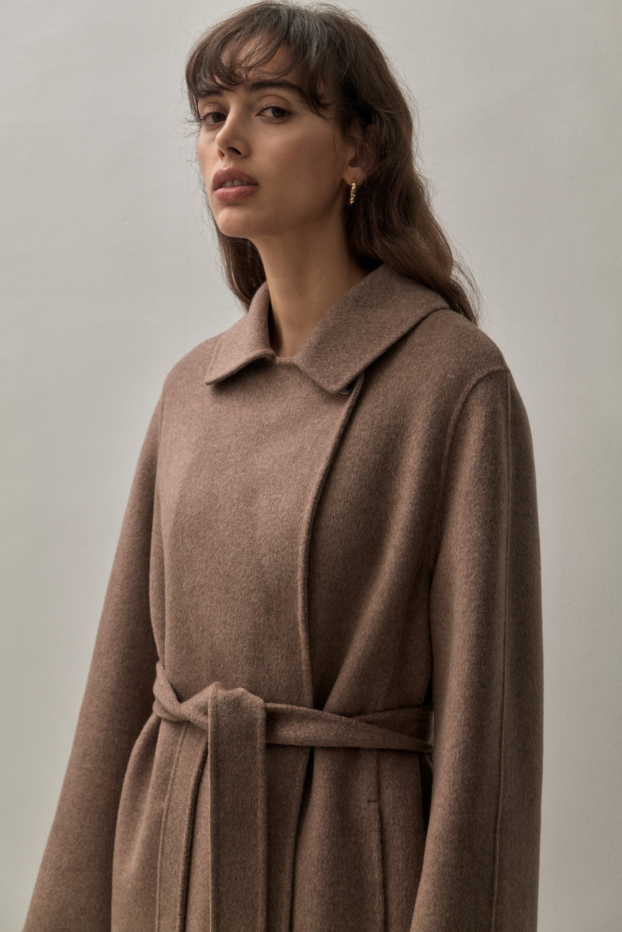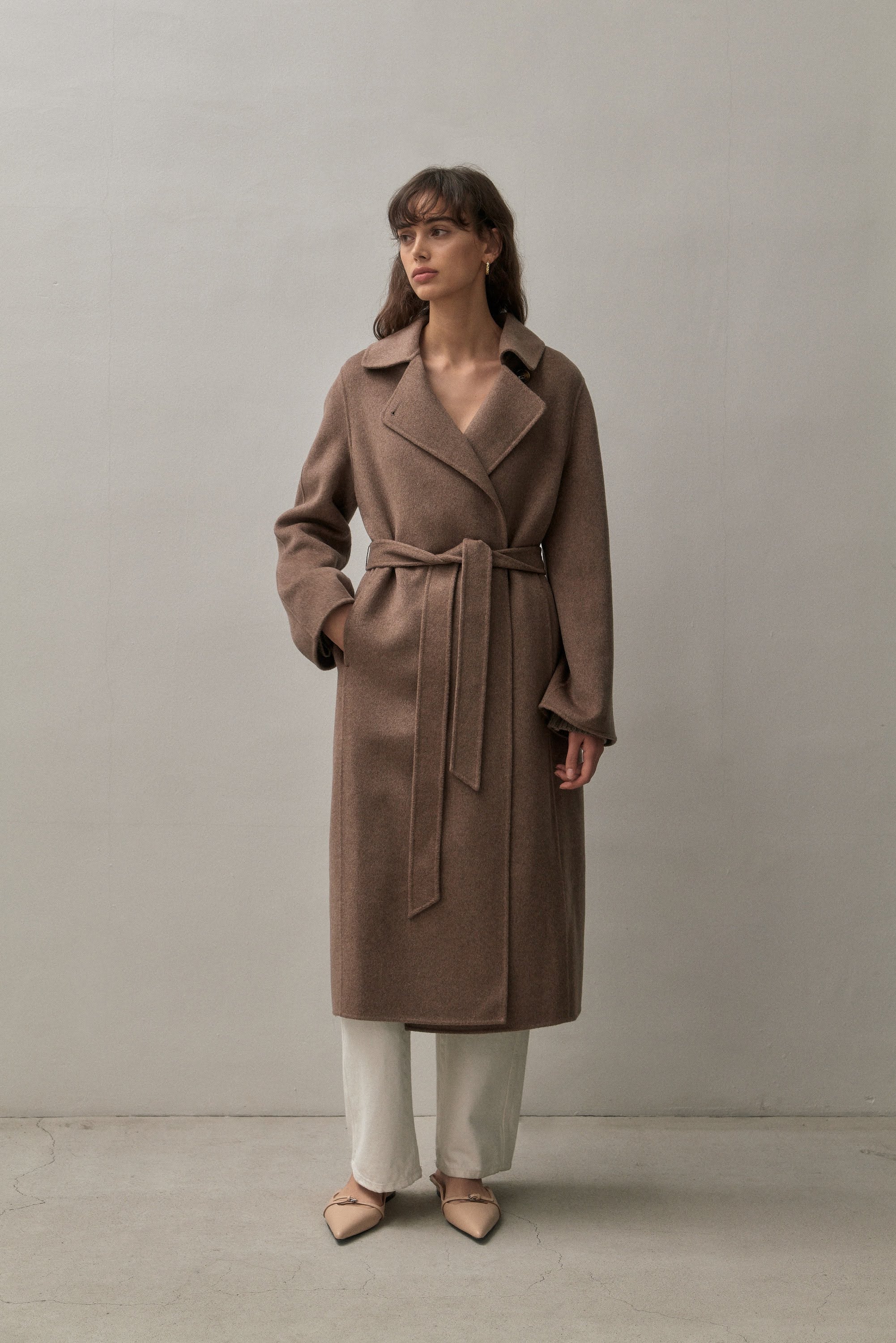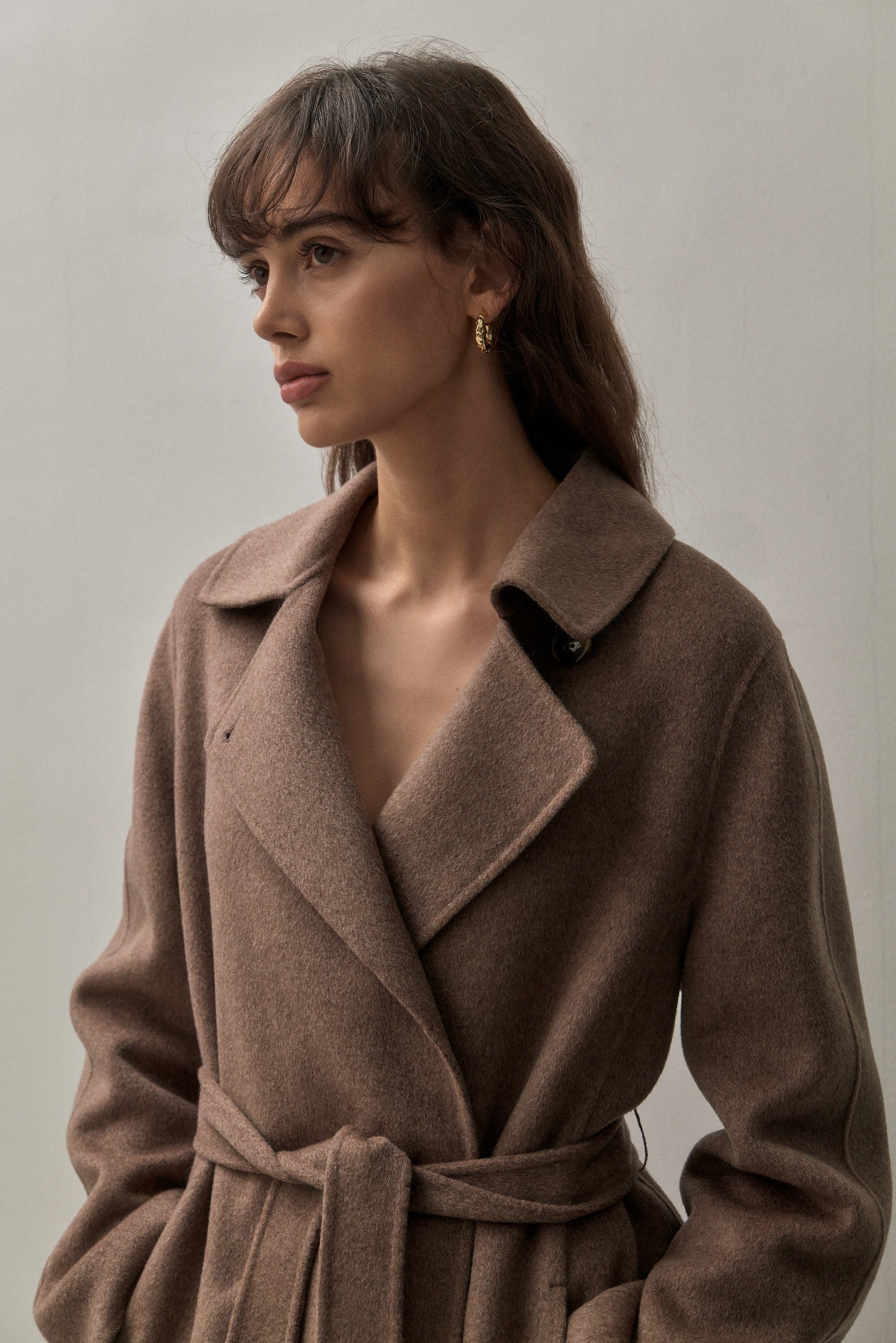 Our double faced coats are created with our signature blends of cashmere and superfine merino wool, sourced from Inner Mongolia. This cashmere is celebrated for its softness, warmth, and lightweight properties, making it an ideal choice for luxurious outerwear. Complementing the cashmere, our fine merino wool is known for its incredible softness and excellent thermal regulation, adding durability and resilience to the fabric, ensuring our coats maintain their shape and beauty over time.