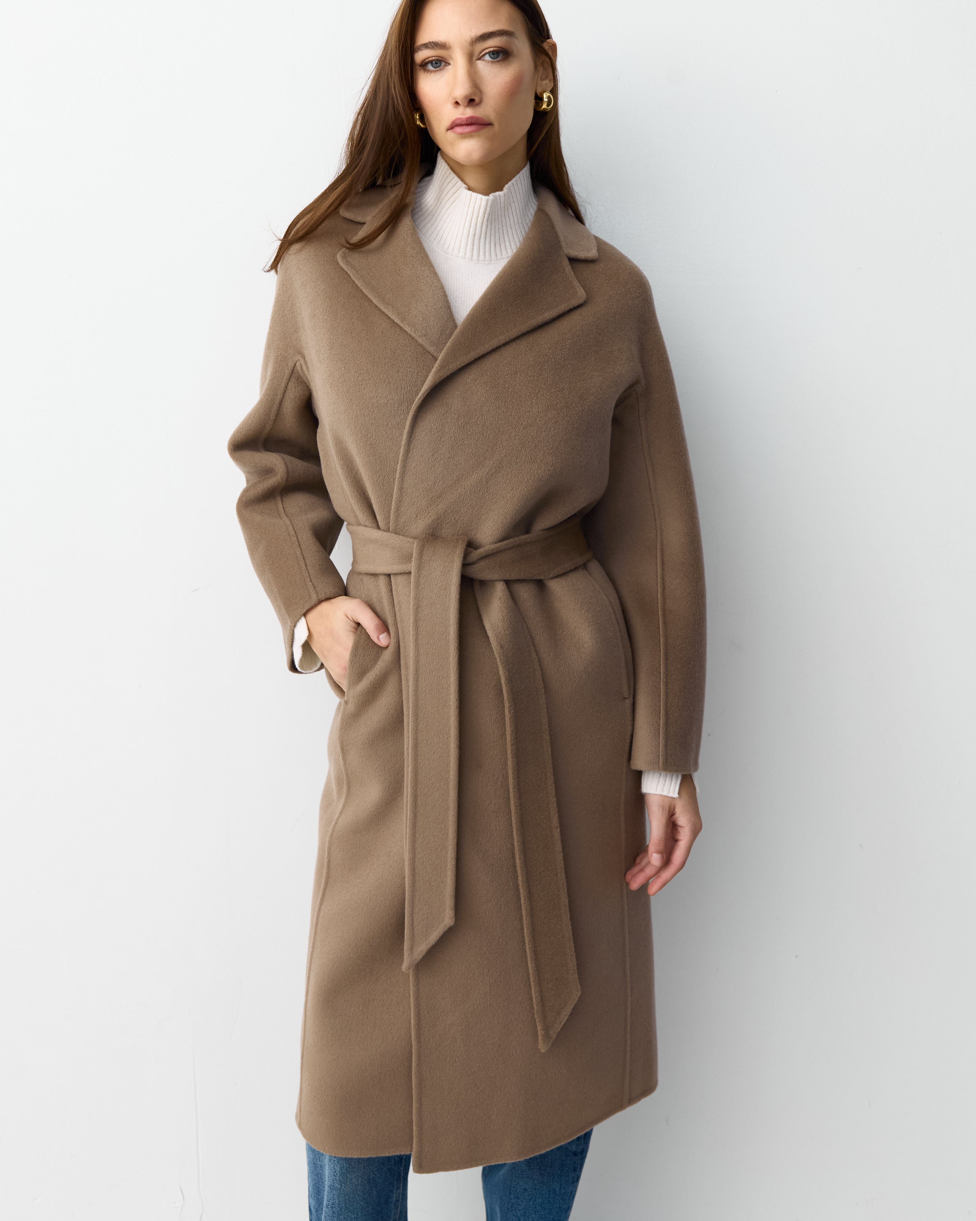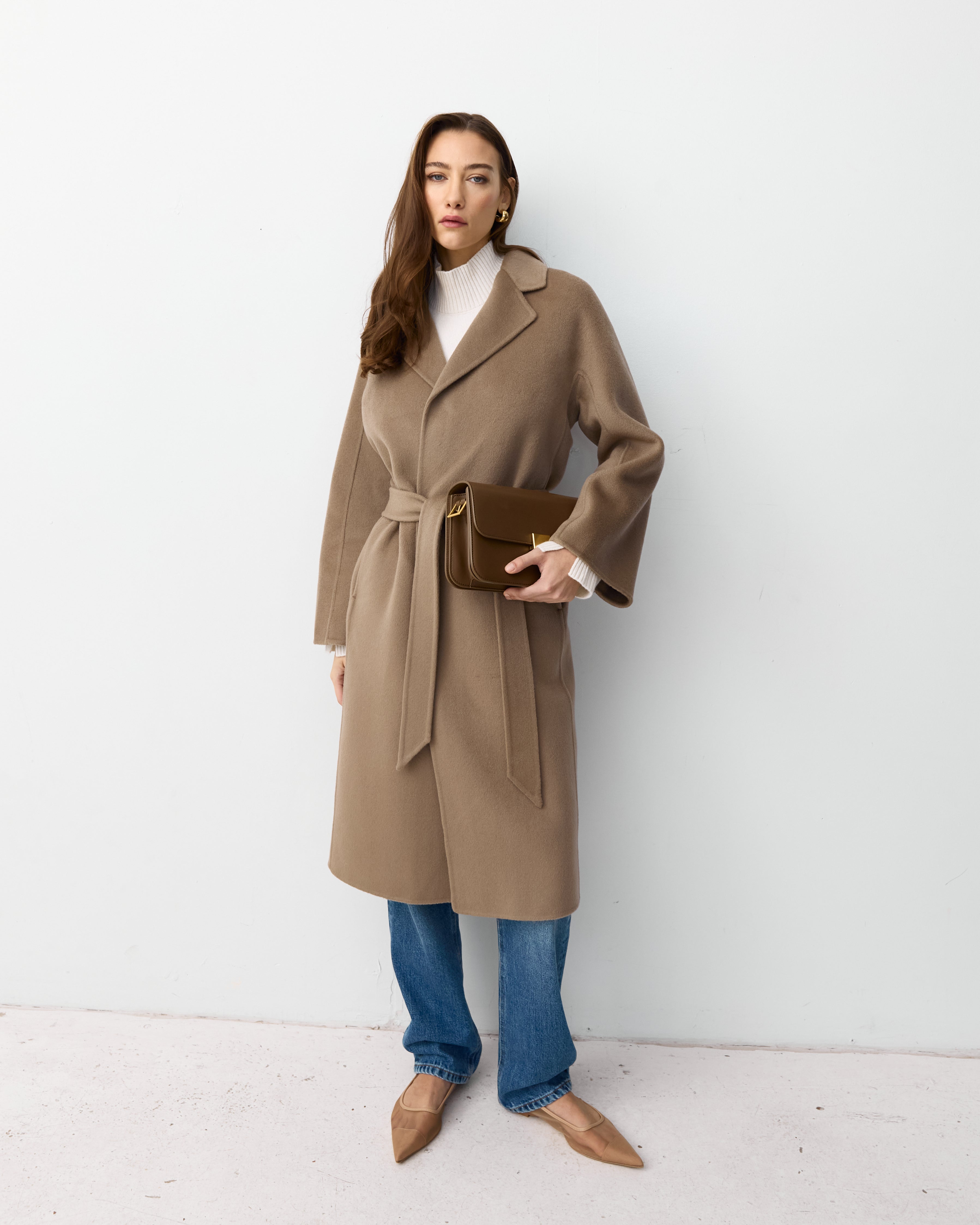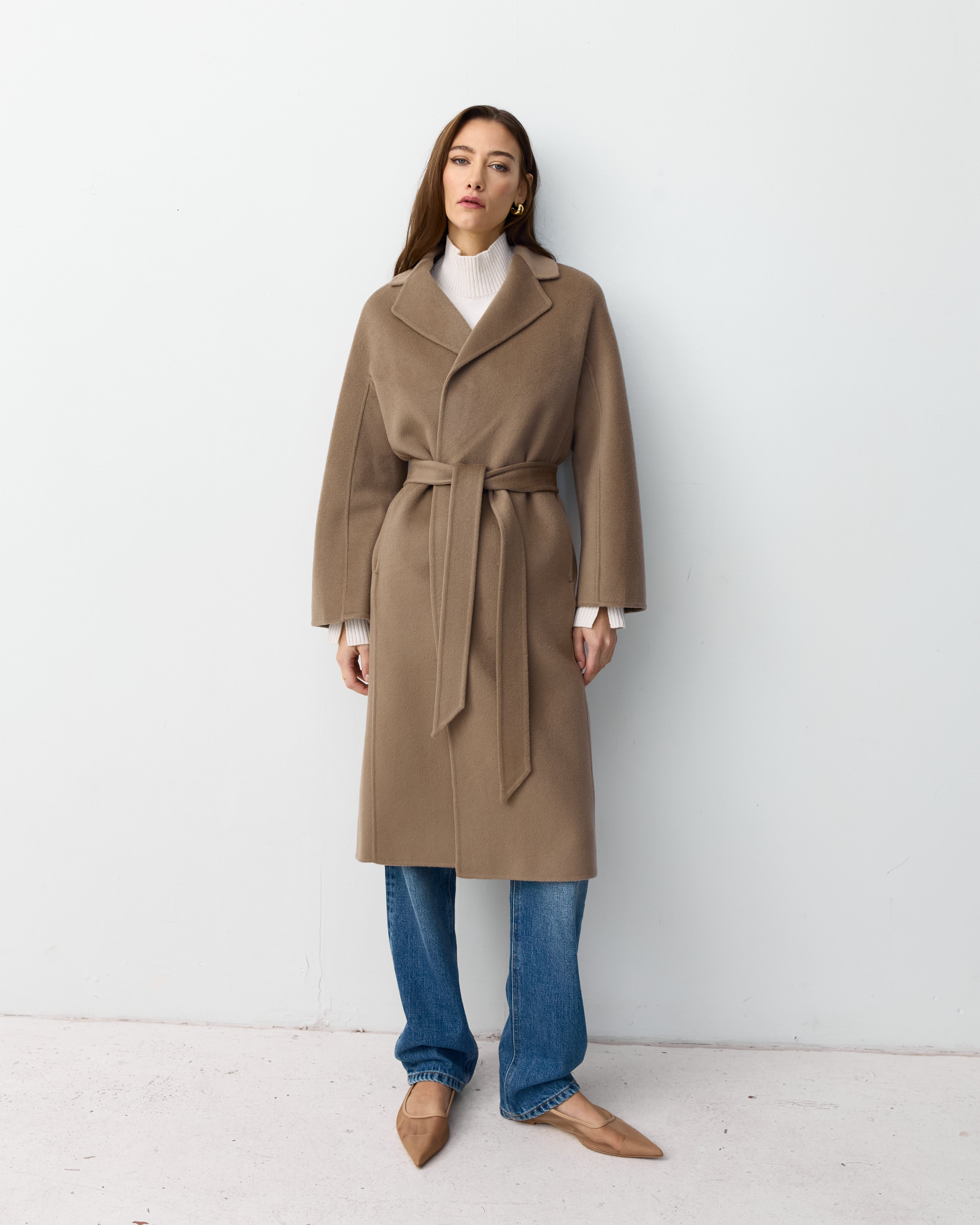 Our double faced coats are created with our signature blends of cashmere and superfine merino wool, sourced from Inner Mongolia. This cashmere is celebrated for its softness, warmth, and lightweight properties, making it an ideal choice for luxurious outerwear. Complementing the cashmere, our fine merino wool is known for its incredible softness and excellent thermal regulation, adding durability and resilience to the fabric, ensuring our coats maintain their shape and beauty over time.