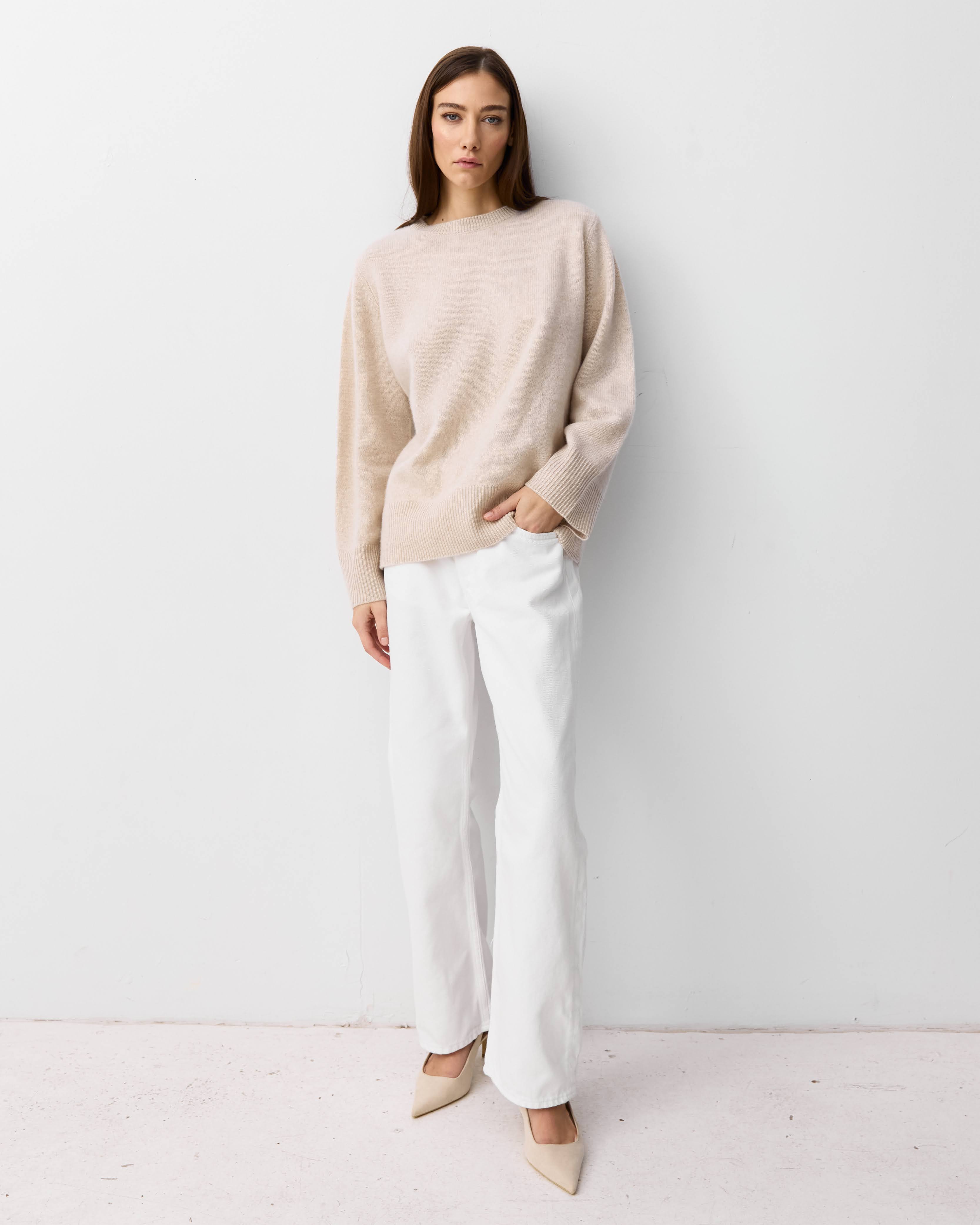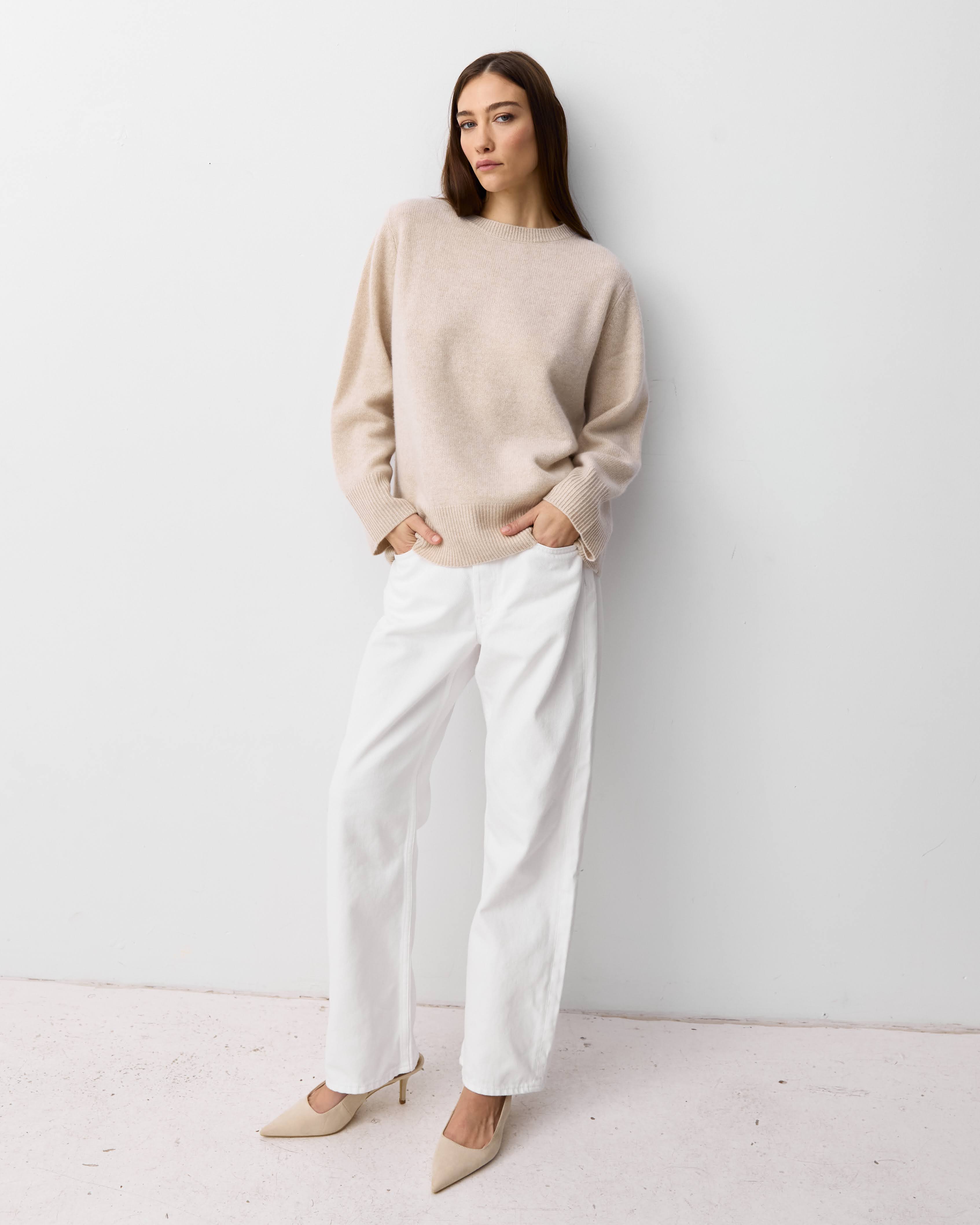 There is nothing more essential than a classic cashmere crew knit. Designed with a relaxed fit, bell sleeves and made with our signature royal cashmere this is a beautiful piece you can wear layered over denim or tucked into a silk skirt.