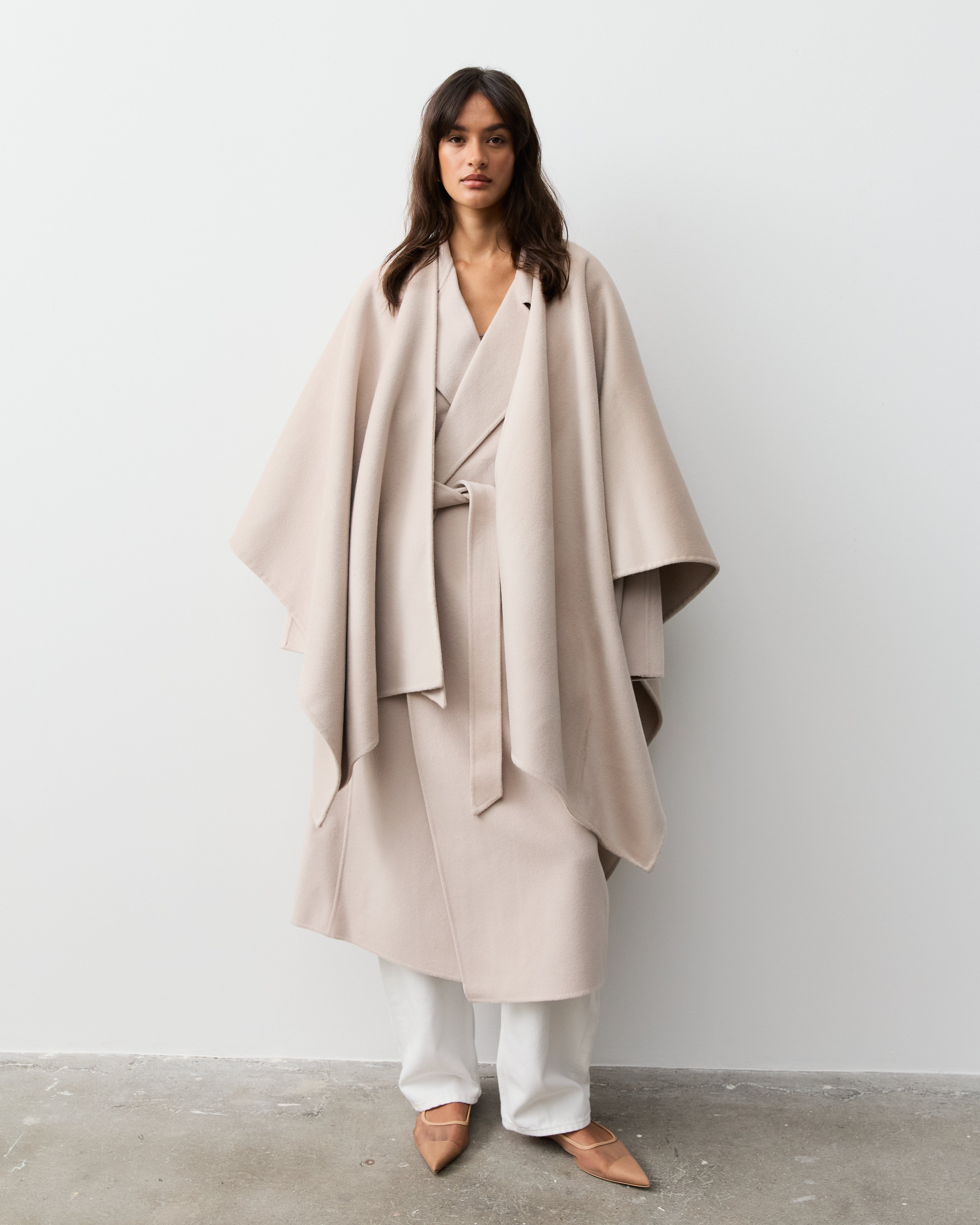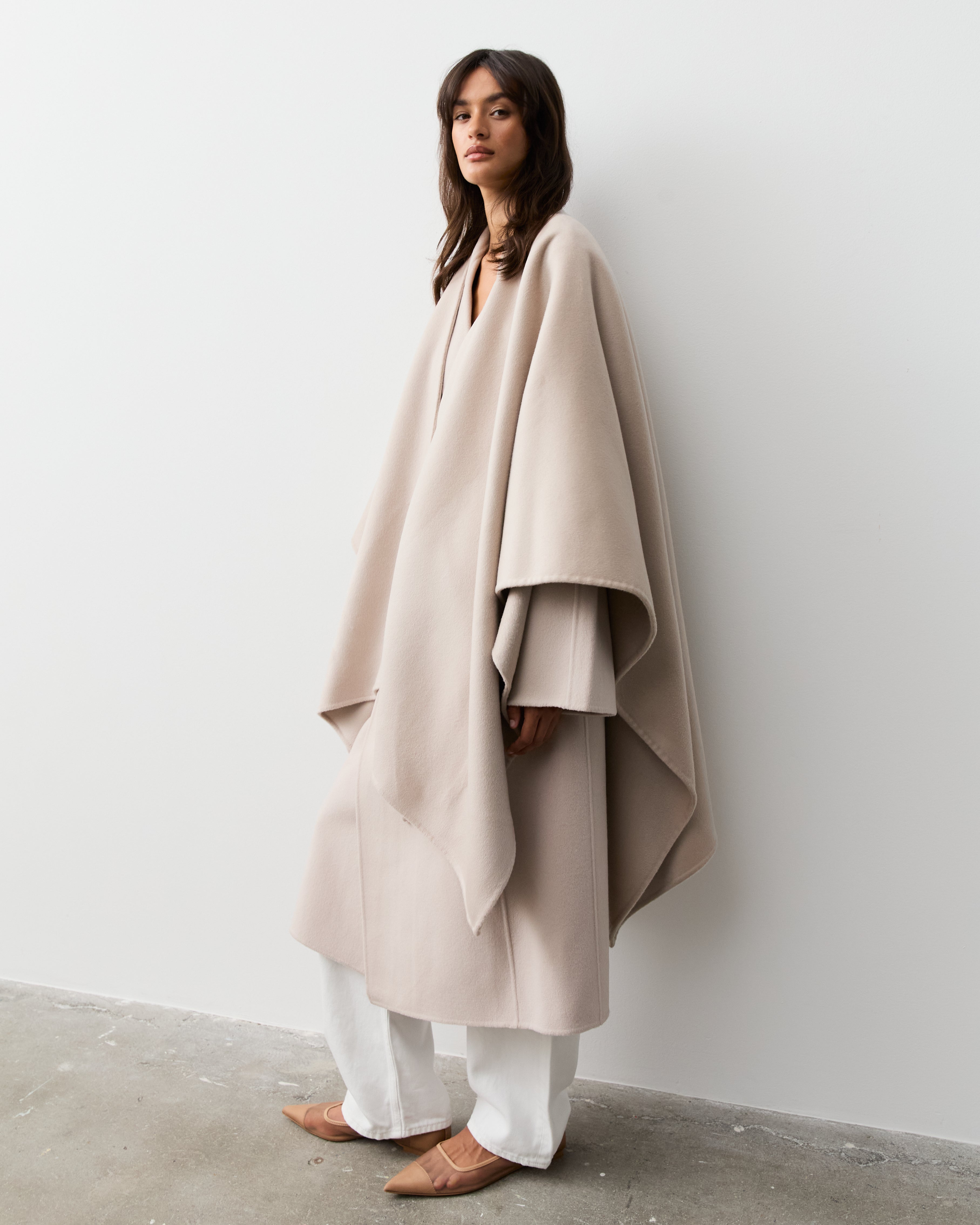 Indulge in luxury with our cashmere cape crafted in our signature double faced fabric. The perfect piece to transition your wardrobe with this season. Layer over our silk essentials, paired with our denim and ballet flats for an effortless work to weekend look.